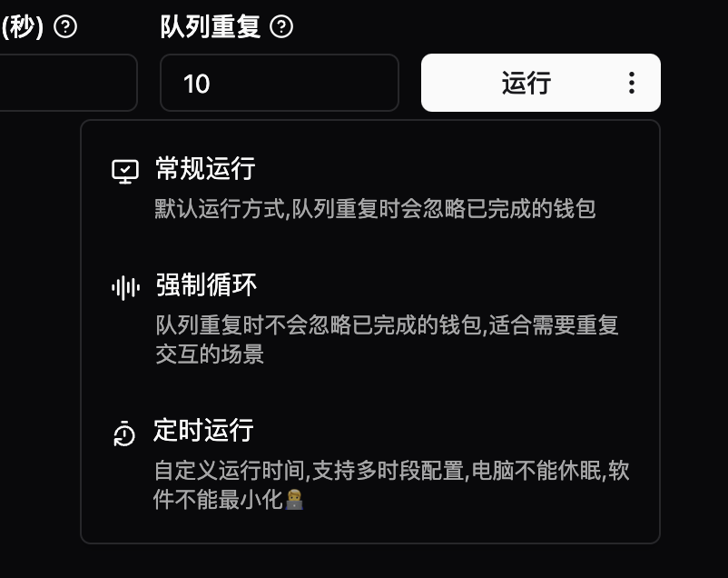 强制循环: 选择后,脚本会一直循环执行队列重复次数定时运行: 选择后,脚本会每隔间隔时间分钟执行一次
